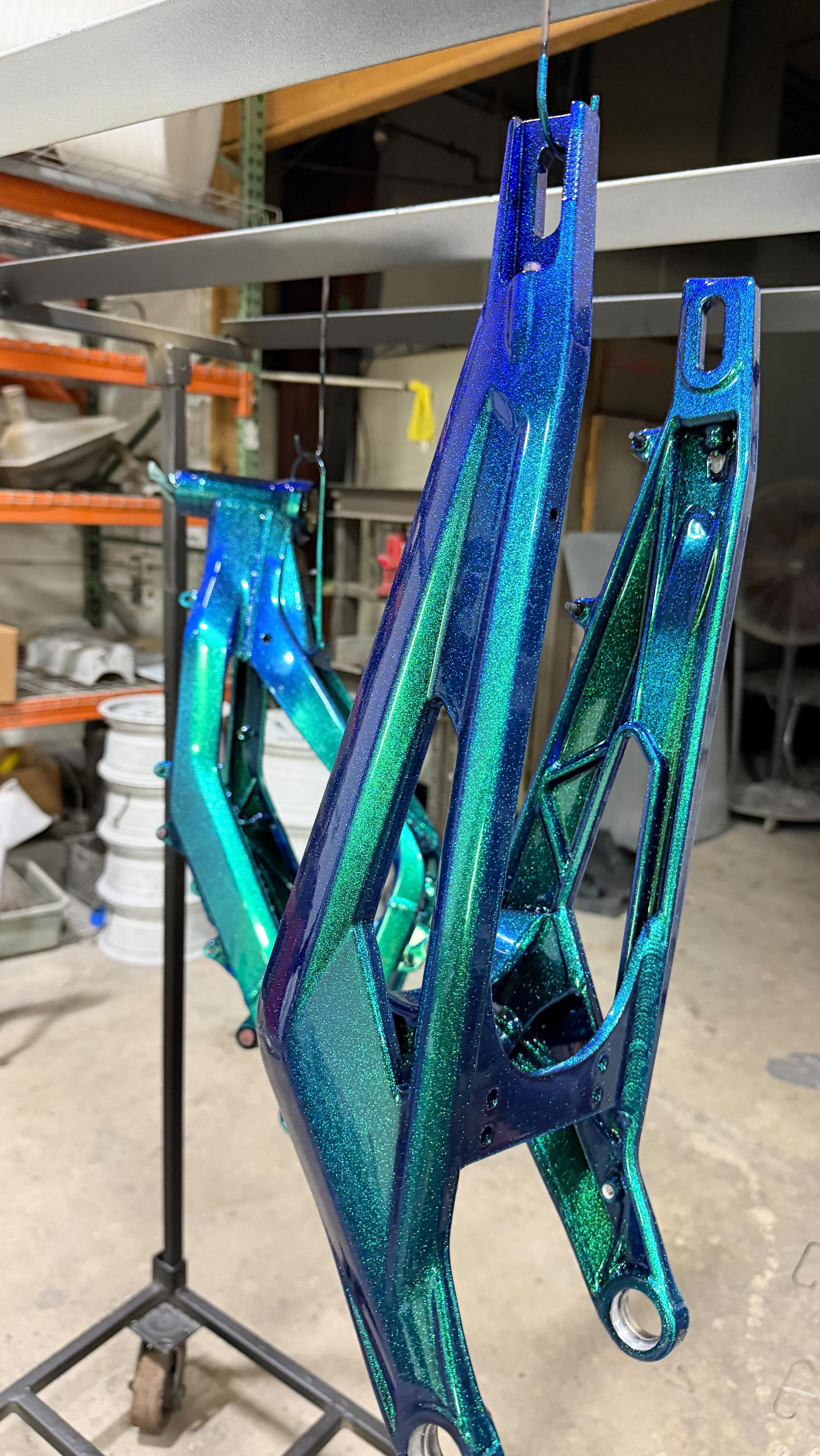 Powder is applied dry and unlike paint, doesn’t require a dry time. The parts are cured in an industrial oven at up to 400 degrees. Once they’re cool to the touch, they’re ready to be put into service. Some parts require special epoxy primers or clear coats that further protect the metal and coating from the elements.
